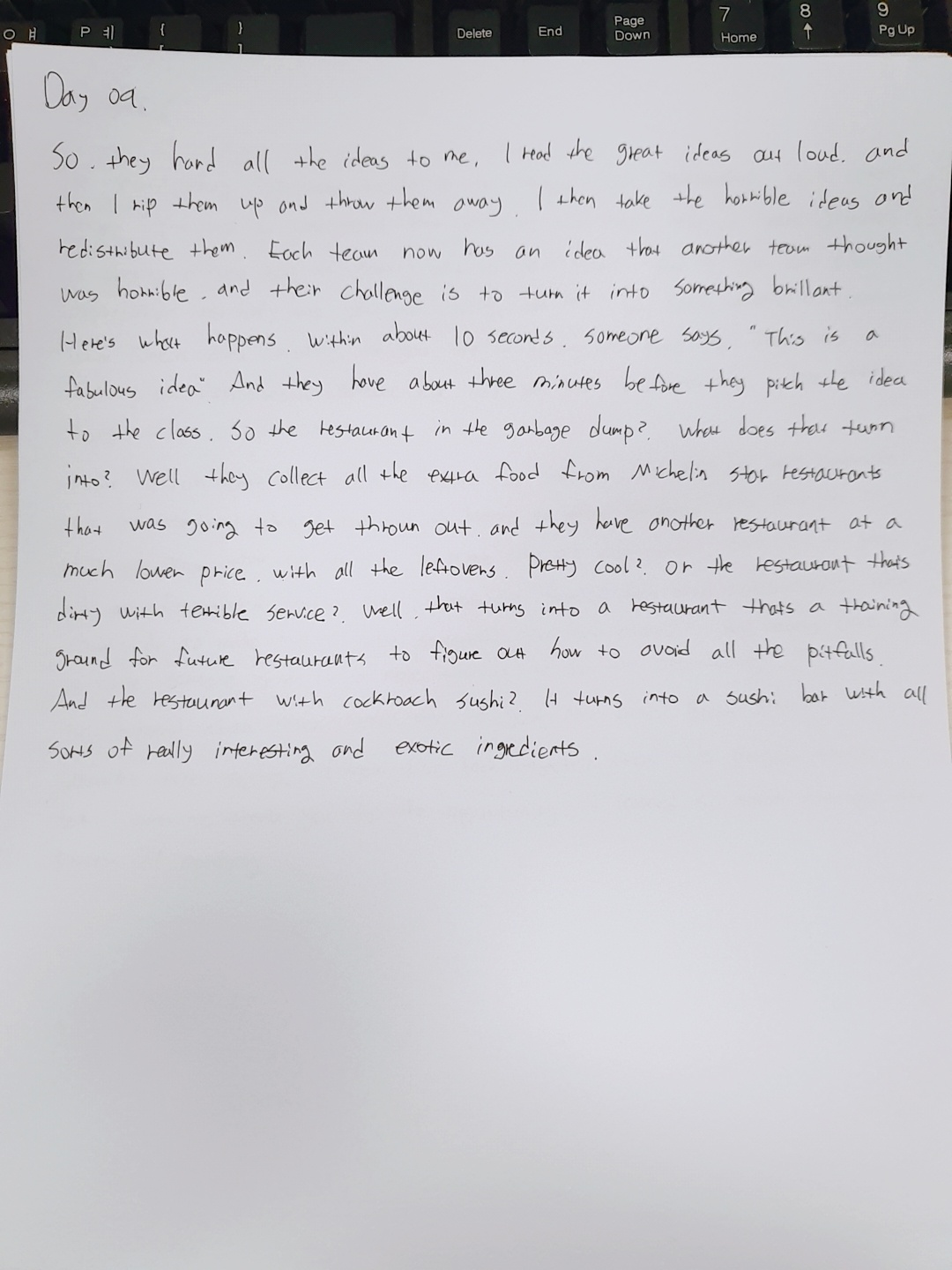 락생들이 모든 아이디어를 제출하고 나면, 저는 멋진 아이디어들을 크게 소리내서 읽습니다. 그리고는 그것들을 찢어서 버려버리죠.